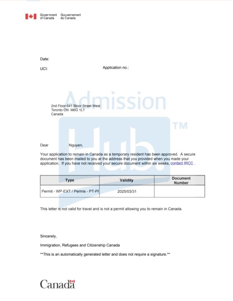 Trải qua hơn một tháng rưỡi hồi hộp chờ đợi, chị Nguyễn Kim Ngân đã nhận được thông báo từ Lãnh sự quán Canada vào ngày 18/07/2023. Visa của chị đã được gia hạn thành công, mở ra cánh cửa để chị theo đuổi ước mơ học tập tại Toronto School of Management. Visa mới của chị có hiệu lực đến 31/03/2025, đảm bảo cho chị đủ thời gian để hoàn thành chương trình học và tiếp tục khám phá những cơ hội mới tại Canada.