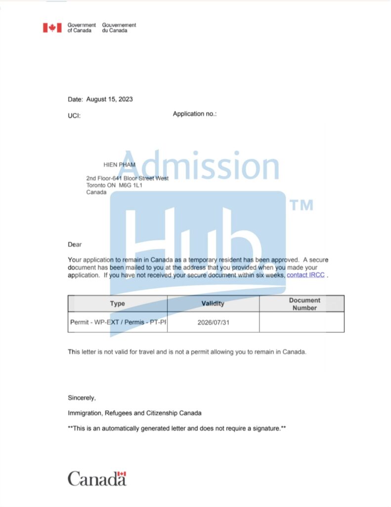 Vì vậy, để có thể học tập tại Canada, Hiền đã chọn chuyển đổi visa du lịch sang visa du học Canada tại Admission Hub. Hồ sơ chuyển đổi của Hiền được nộp vào ngày 11/8 chỉ trước ngày hết hạn visa du lịch 1 ngày.
